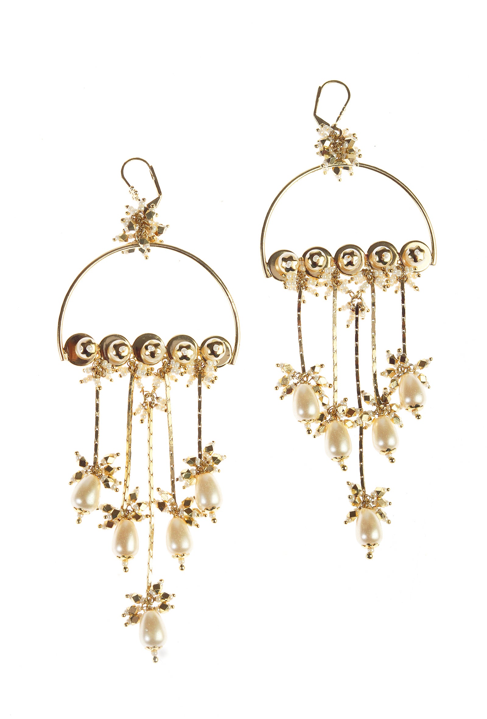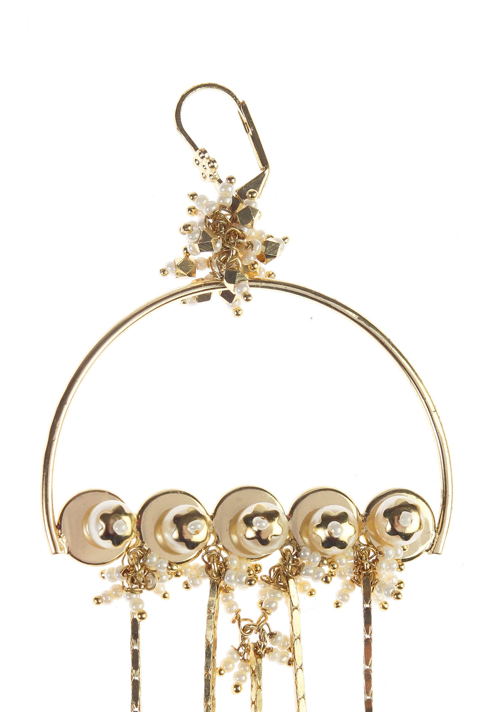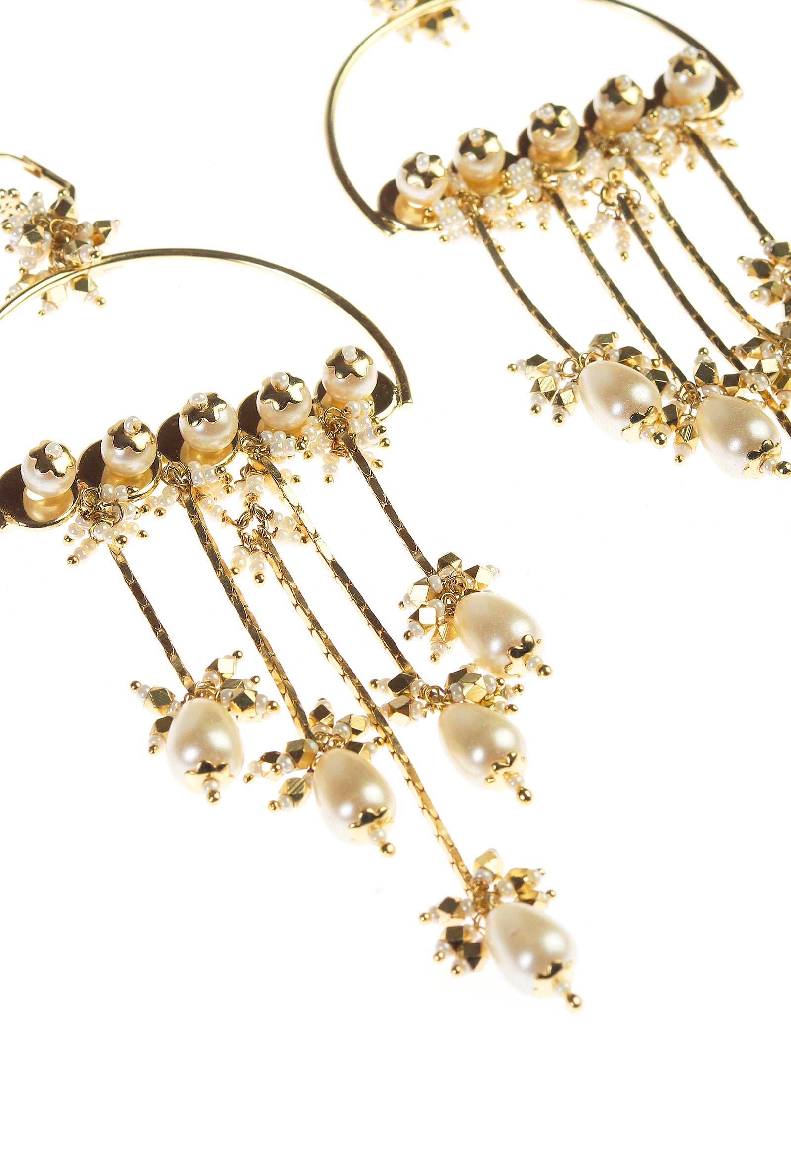 A long dangler earring inspired by the classic Chand Bali silhouette, designed as a statement piece. Intricately decorated with delicate pearl work, it is finished with gracefully hanging brass and pearl elements that add movement and charm. Bold yet elegant, this piece is perfect for festive occasions, bridal celebrations, and pre-wedding functions, bringing timeless beauty and handcrafted allure to any look.