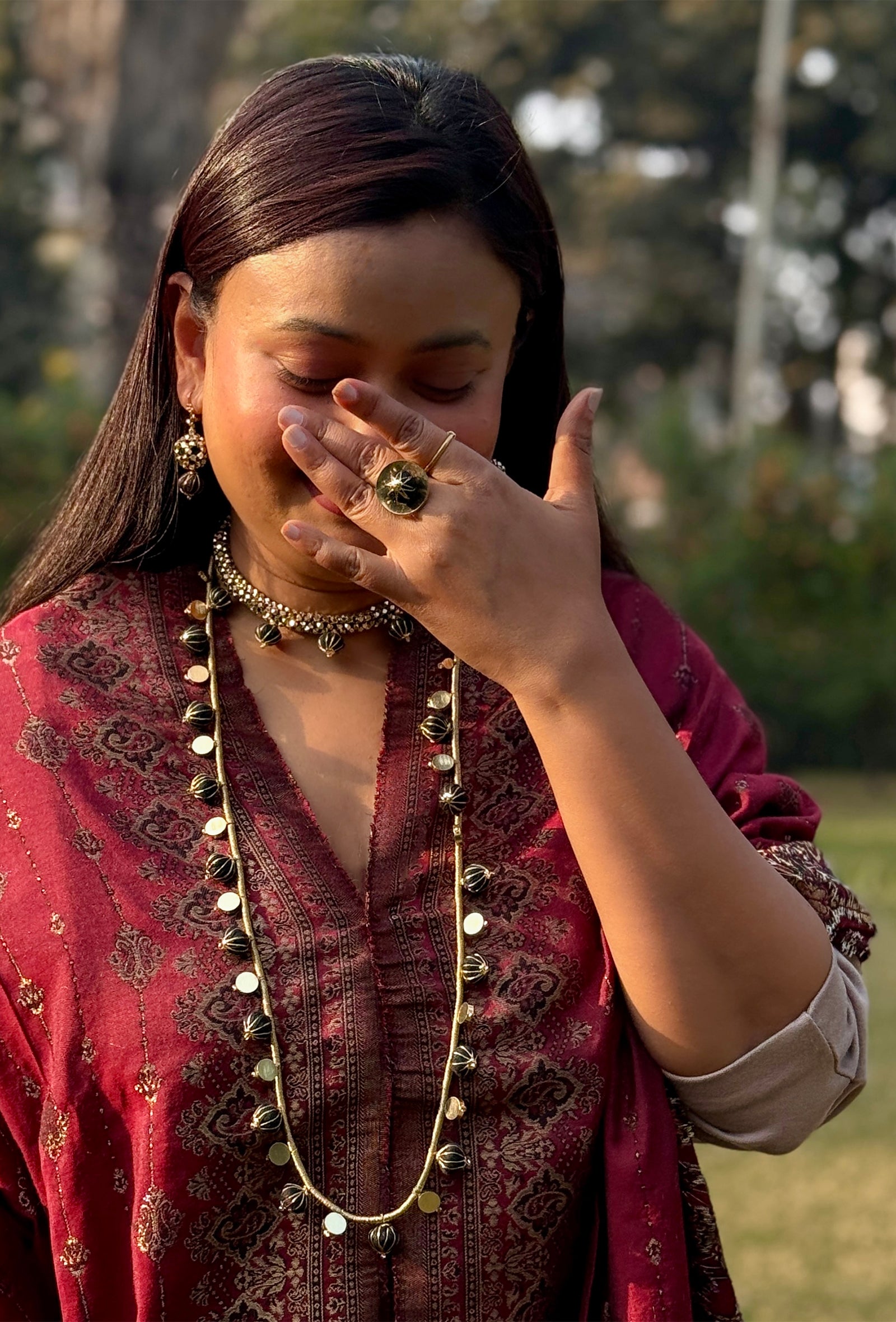 This ring features a rounded form handcrafted with cotton thread, finished with intricate zari work on the top. Minimal in design yet rich in texture, it brings together traditional thread craftsmanship and a modern silhouette, making it an effortless everyday statement piece.