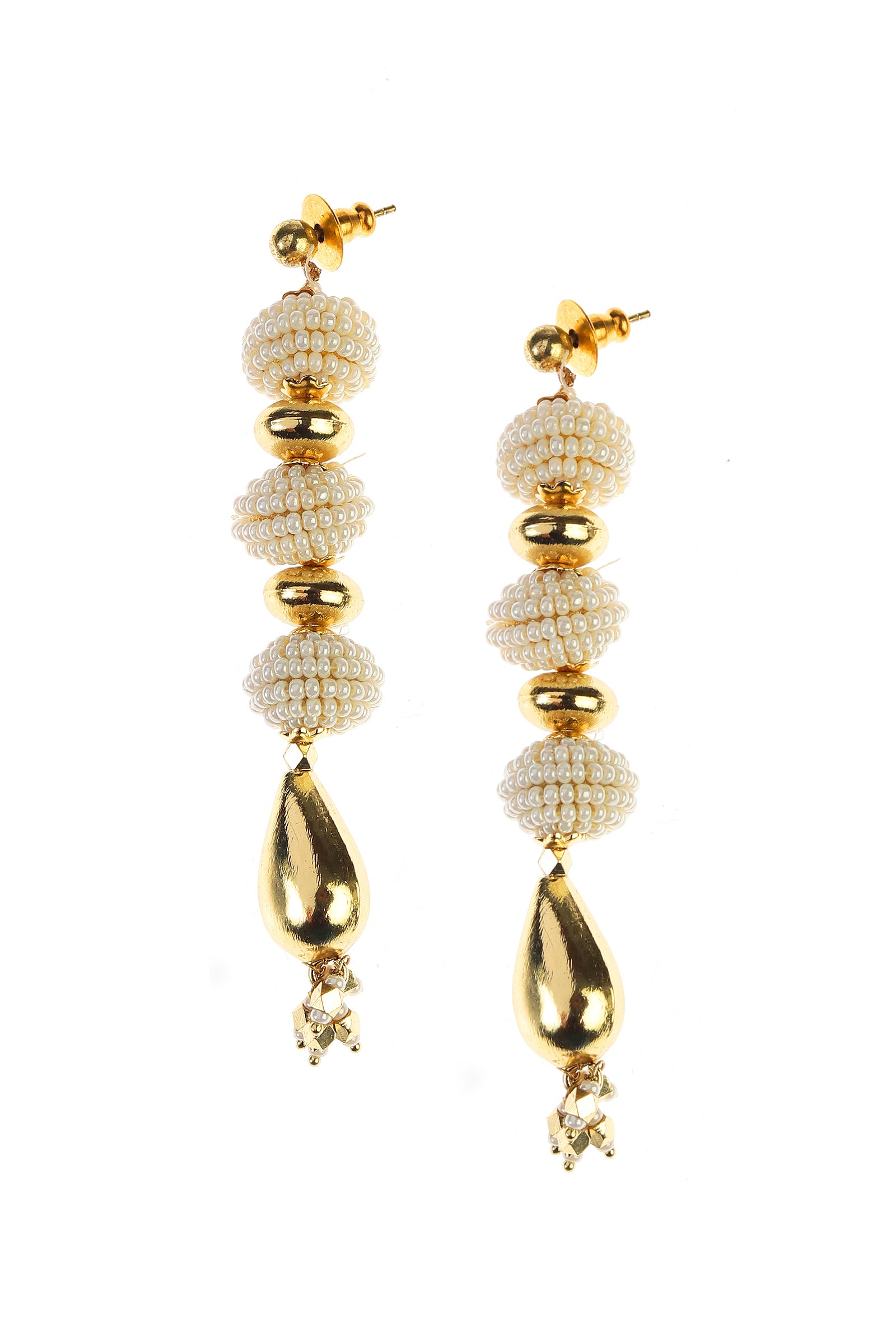 Bold and elegant, these statement dangler earrings feature a harmonious mix of pearls and brass beads, crafted to catch the eye while maintaining a refined aesthetic. Designed to create movement and shimmer, they are perfect for bridal ensembles, festive celebrations, and pre-wedding events. Lightweight yet striking, these earrings combine artisanal craftsmanship, intricate detailing, and contemporary flair, making them a versatile statement piece that elevates any look.