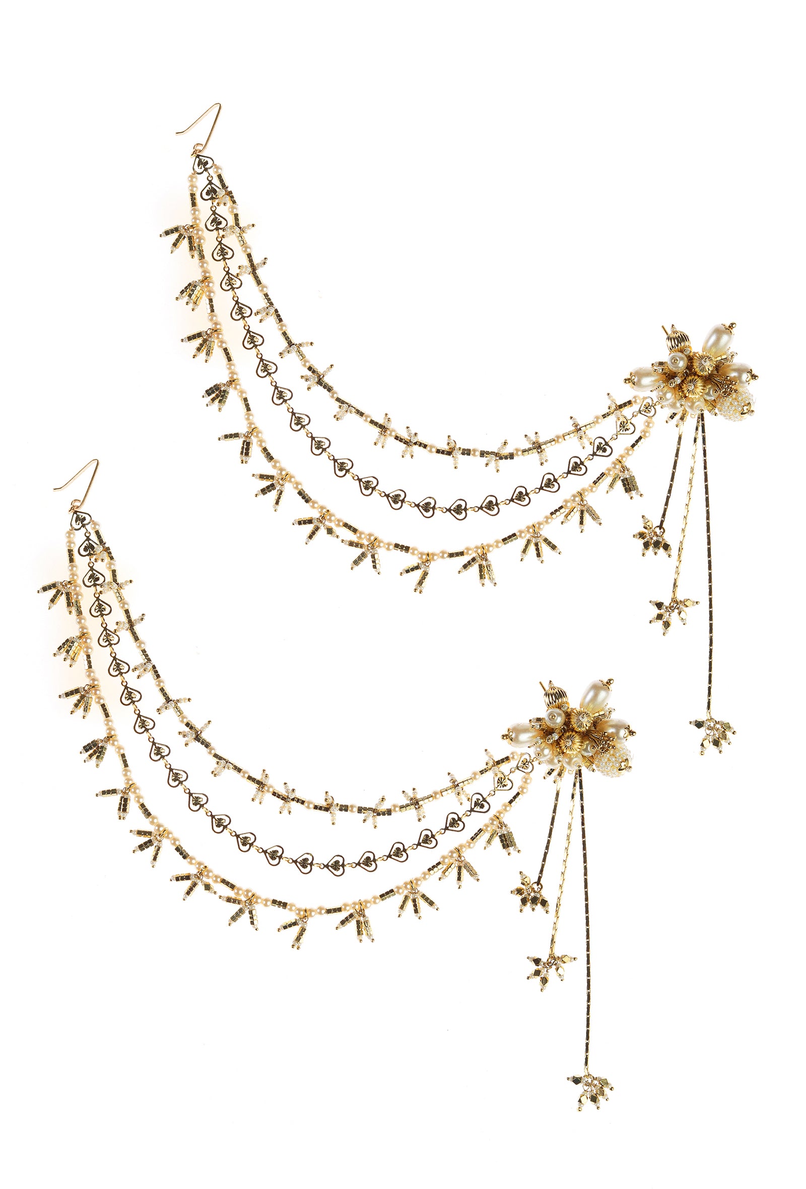 Elegant and statement-making, these ear chain earrings feature intricate craftsmanship with pearls and brass beads, designed to drape gracefully along the ear. The connected chain creates movement and flow, adding a refined, contemporary twist to traditional earrings. Perfect for bridal looks, pre-wedding events, and festive celebrations, these earrings balance boldness with sophistication, making them a versatile accessory that elevates any ensemble.