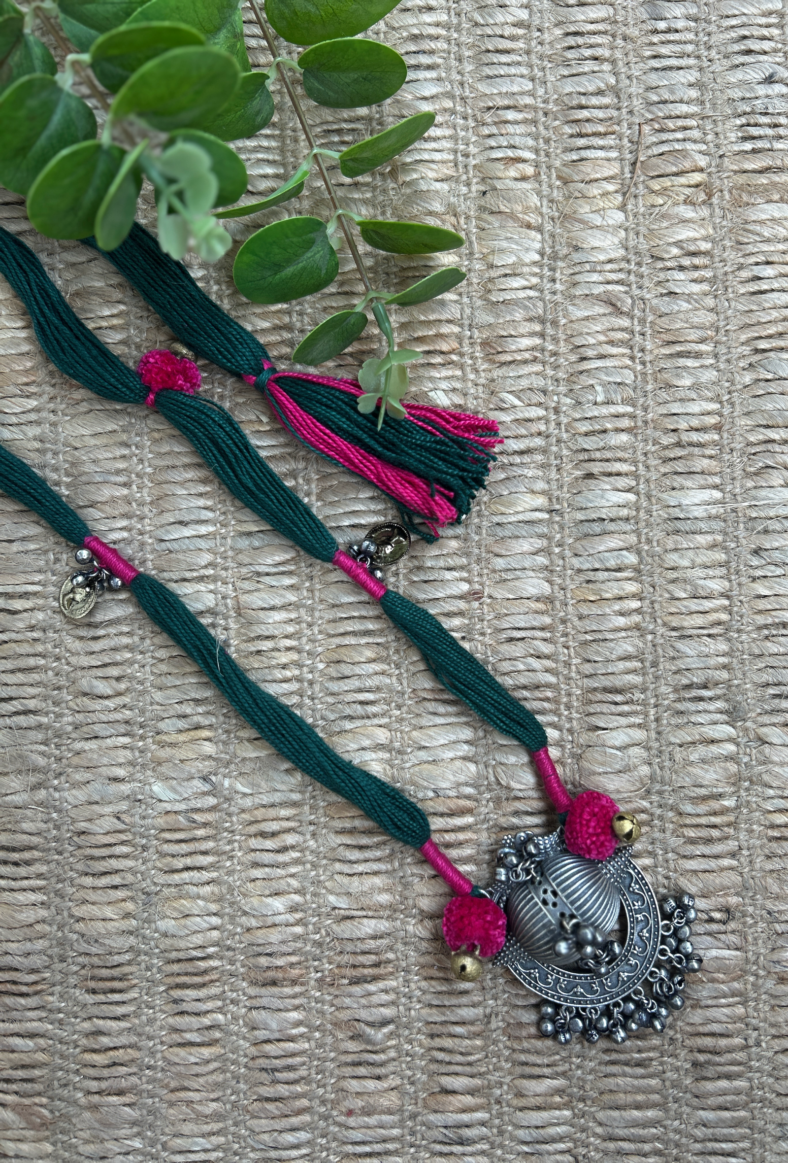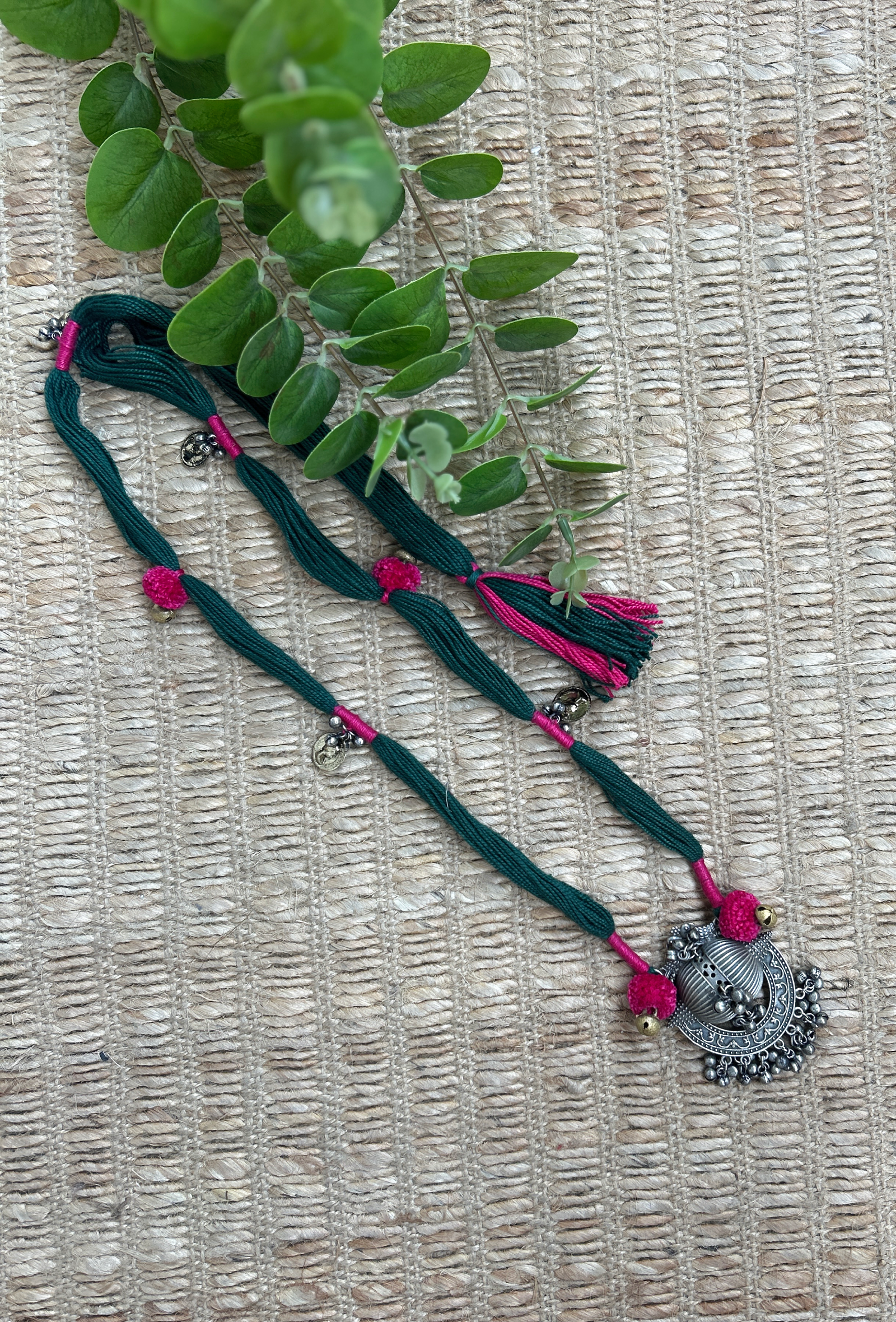 A graceful blend of color and craft, this long statement necklace is handcrafted with rich green cotton threads, highlighted with vibrant pink accents. The intricate brass pendant, finished in antique silver tones, is beautifully detailed and adorned with delicate ghungroos that add a soft, rhythmic charm to every movement.