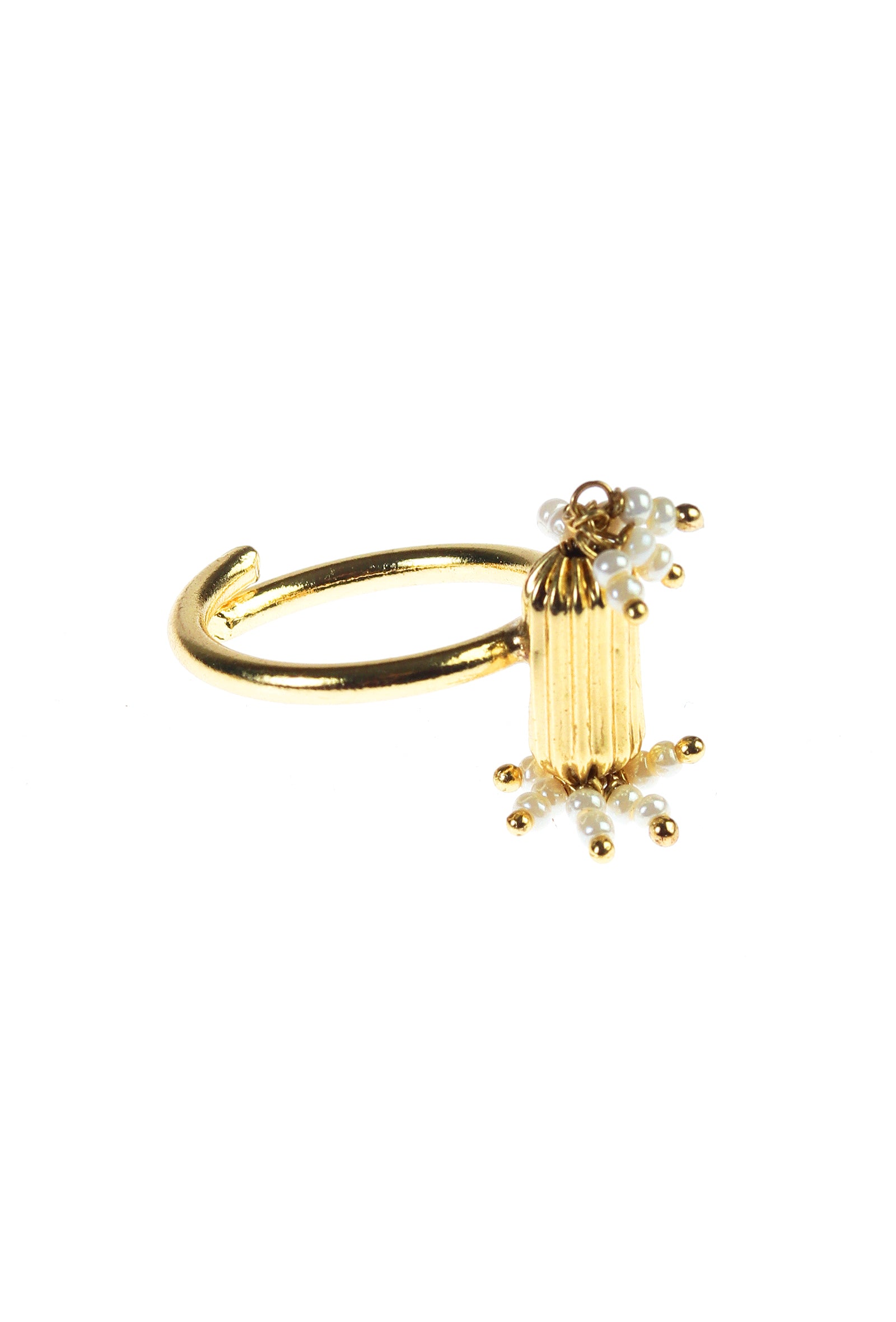 A simple yet striking statement ring, crafted on a sleek metal base and adorned with delicate pearl drops. The design balances minimalism with elegance, creating a piece that catches the eye without overwhelming.