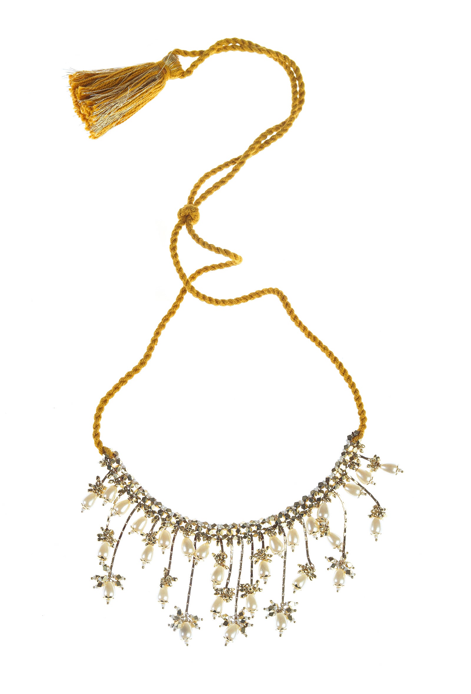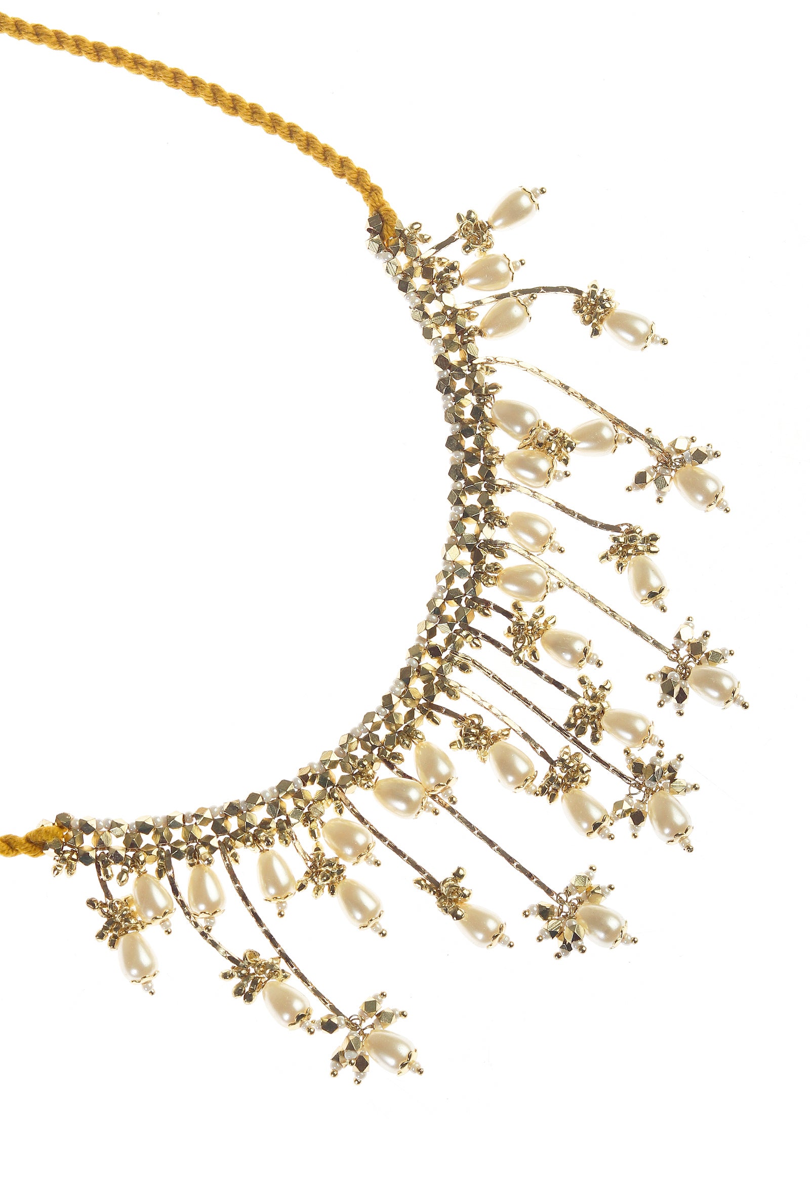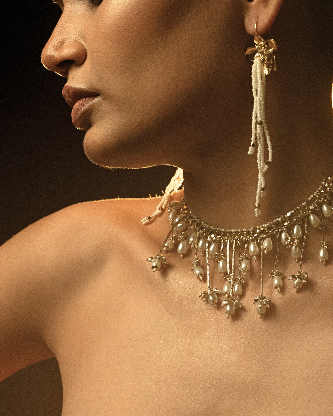 A delicate neckpiece adorned with softly hanging pearls, designed to move gently with every step. Light in form yet rich in detail, this piece celebrates understated elegance and refined craftsmanship. Perfect for festive layering or intimate bridal moments, it adds a subtle glow and timeless charm to any ensemble.