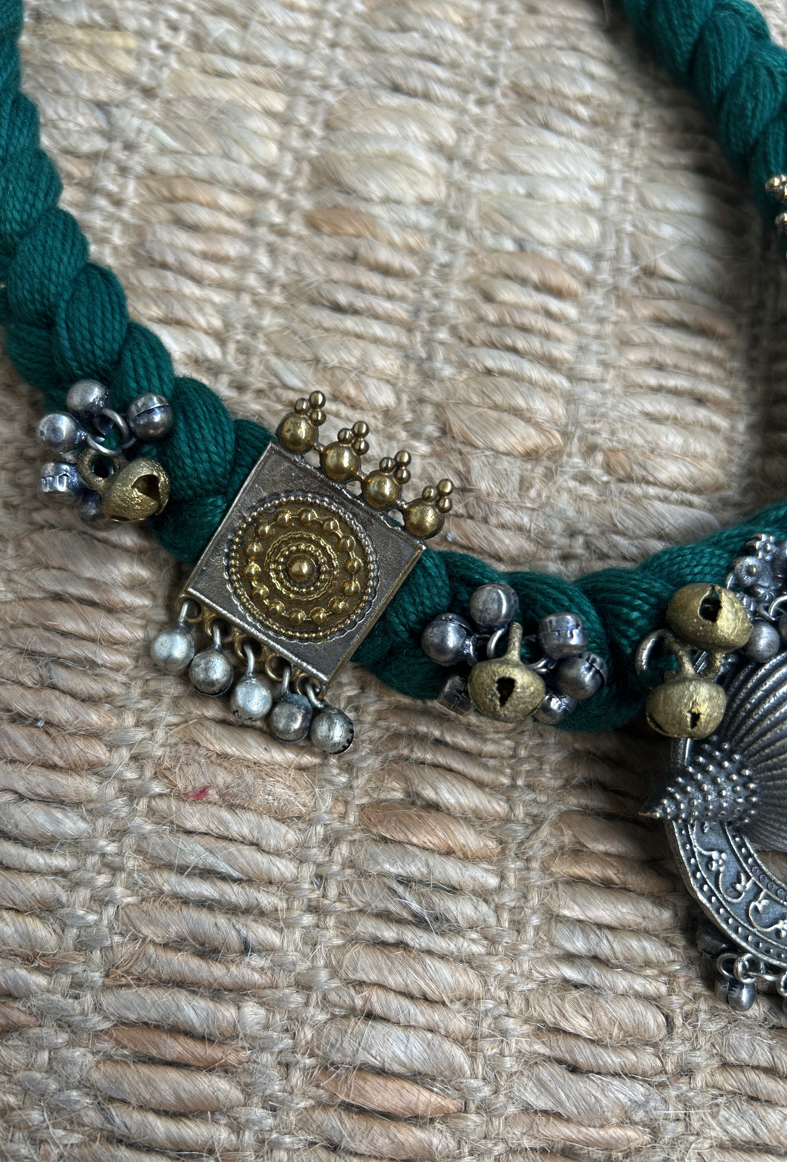 A delicate blend of tradition and playfulness, this handcrafted necklace features a vibrant green cotton thread base adorned with intricately detailed antique-finish brass charms. Accented with hints of golden and silver tones, the centerpiece adds a soft pop of color while tiny metallic elements create a gentle, rhythmic charm with every step.