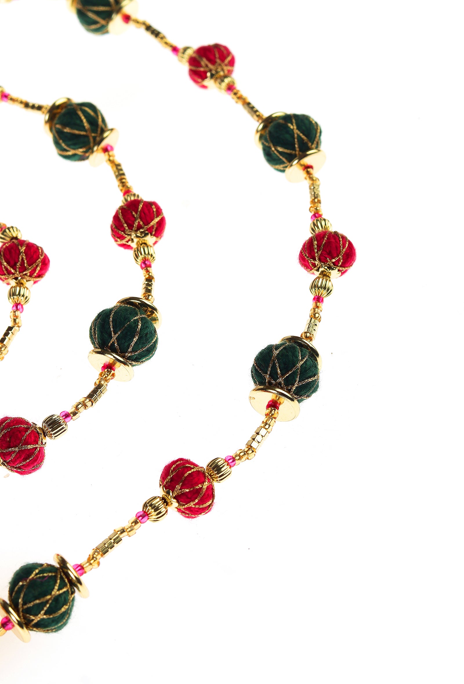 A gentle interplay of green, pink, and gold, Rangmala celebrates colour as emotion and thread as memory. Handcrafted using brass components entwined with cotton and zari thread, this Matar Mala carries the warmth of traditional handwork and the softness of textile-led jewellery.