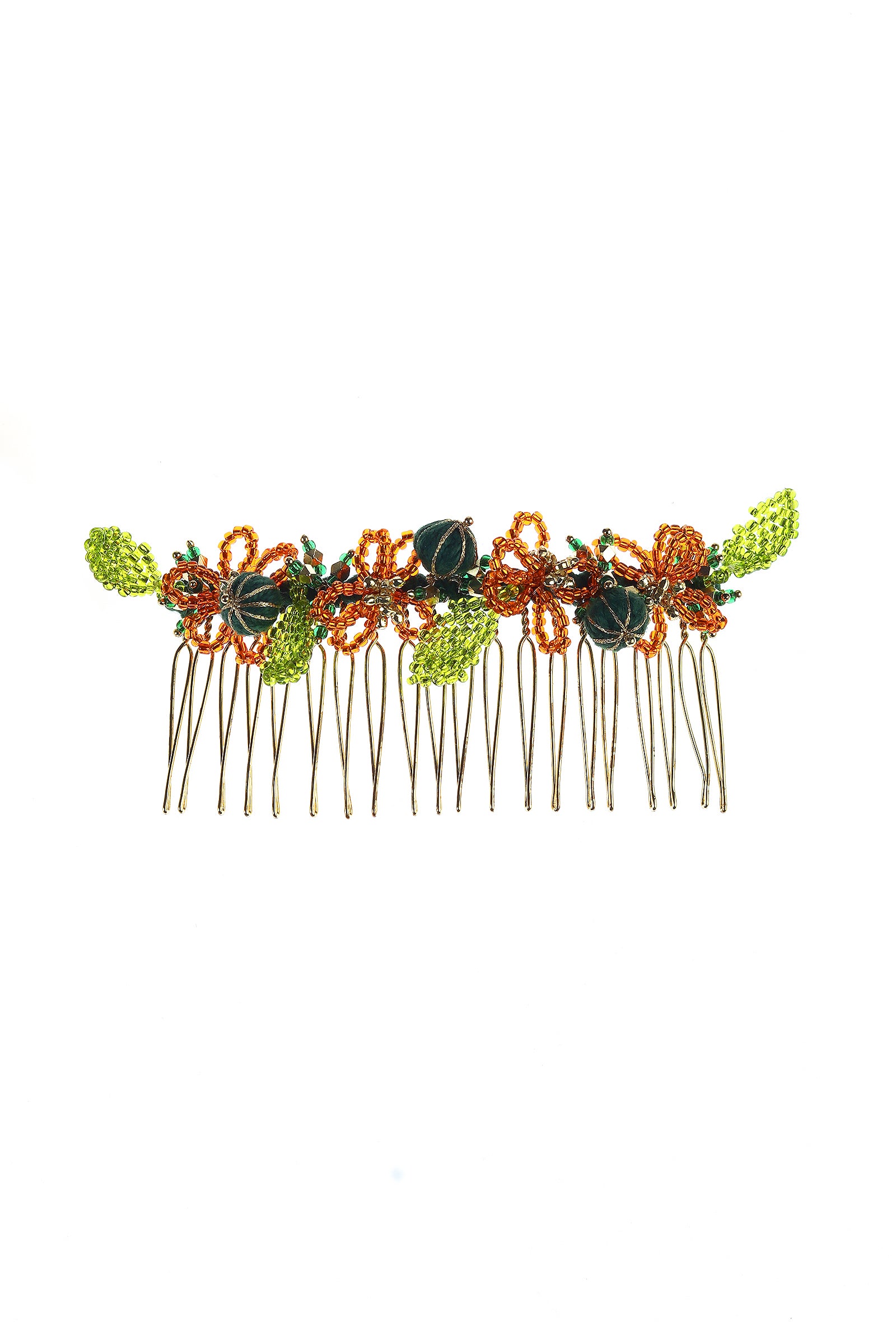 A delicate and vibrant hairpin featuring a handcrafted arrangement of petals and leaves in warm orange, fresh green, and subtle golden accents. Each element is carefully assembled to create a mini floral bouquet, reflecting intricate craftsmanship and a playful yet elegant aesthetic.