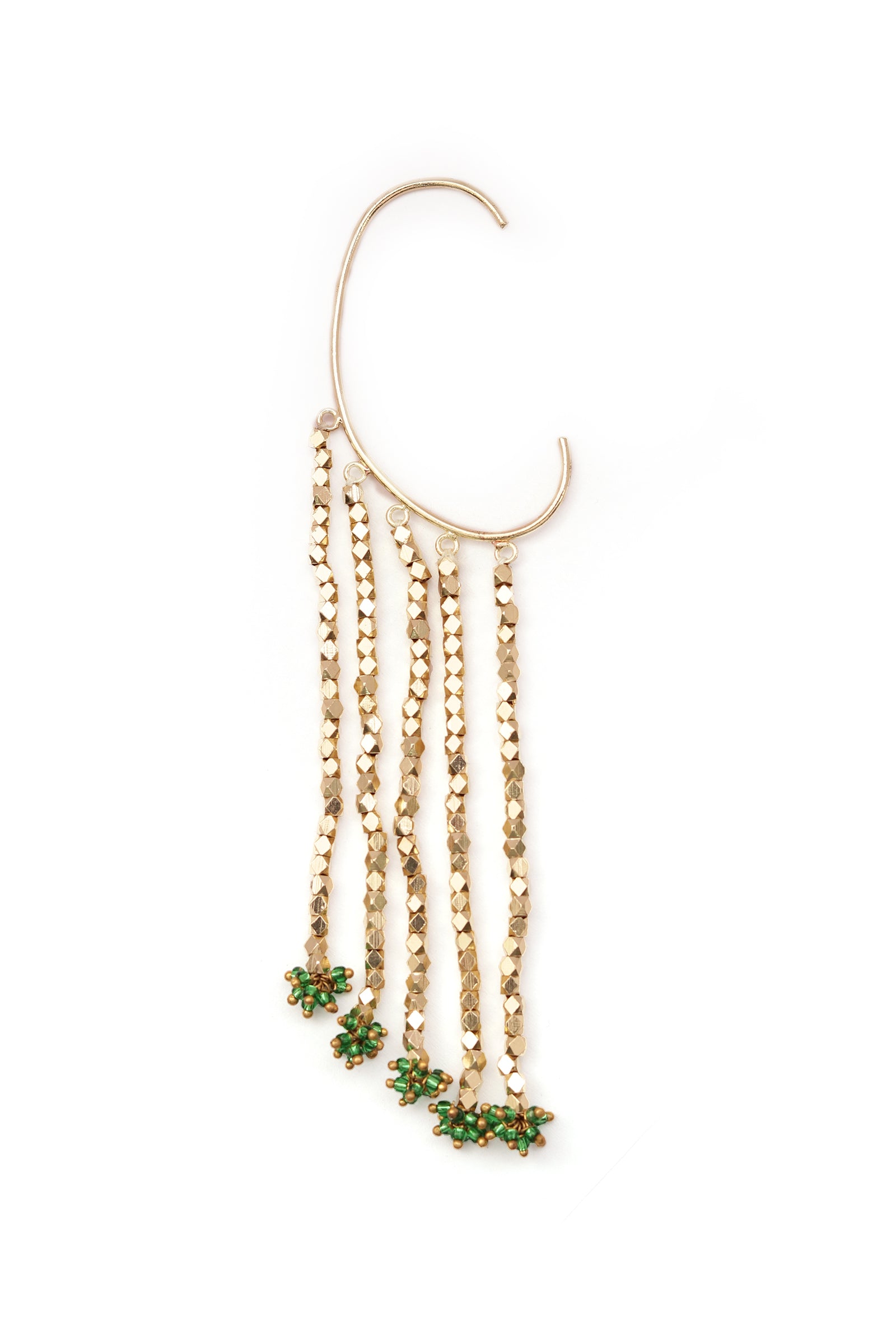- The Ruhani Ear Cuff is a statement piece designed to elevate your style effortlessly. Beautifully crafted in gold-plated brass and adorned with intricately arranged glass beads, it offers a perfect blend of elegance and boldness. The graceful dangling design adds movement and charm, making it a standout accessory for any occasion. Whether paired with traditional attire or contemporary outfits, this ear cuff promises to turn heads and celebrate your unique sense of style.