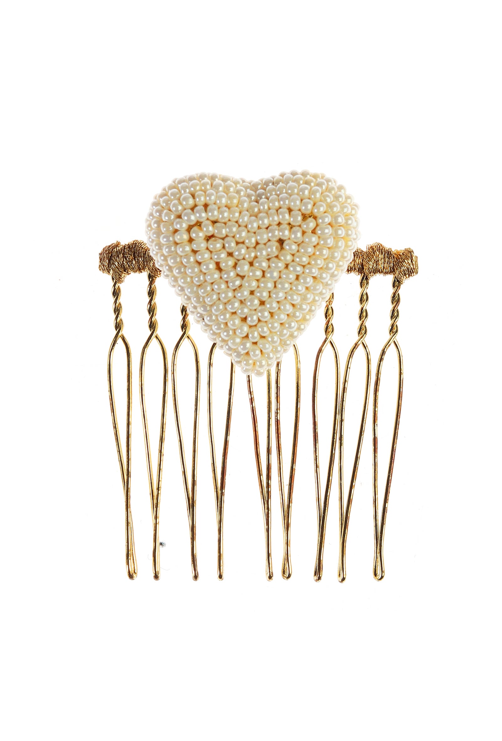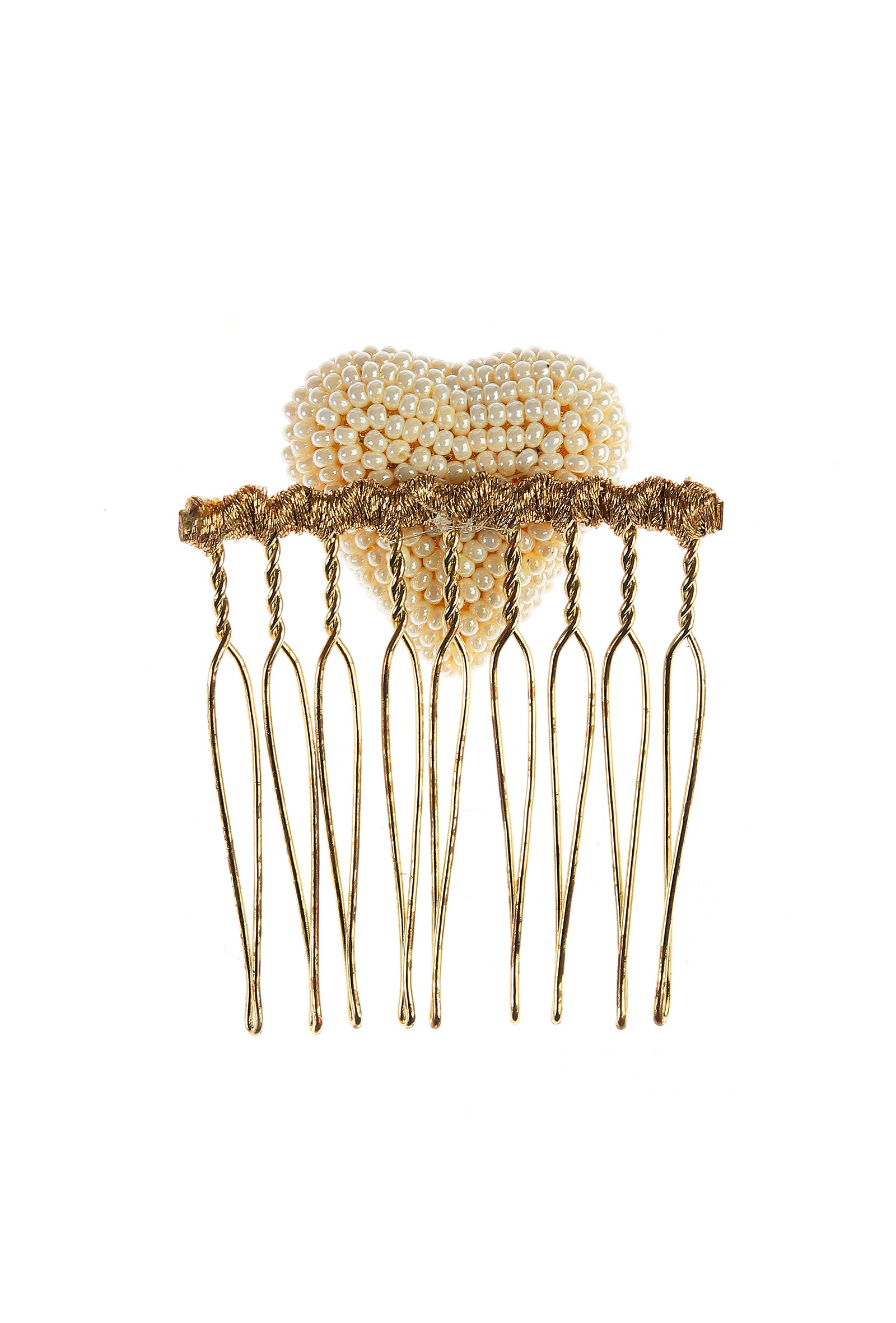 A delicate heart-shaped hair pin adorned with intricate pearl detailing, crafted with precision to add a touch of elegance to any hairstyle. The design balances romance and sophistication, making it perfect for bridal looks, pre-wedding events, and festive occasions. Lightweight yet striking, this hair pin elevates buns, braids, or loose hairstyles, offering a timeless and handcrafted charm.