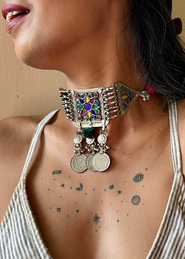 - A bold Afghani choker featuring a square centerpiece with multicolor enamel floral work, framed with antique silver detailing.