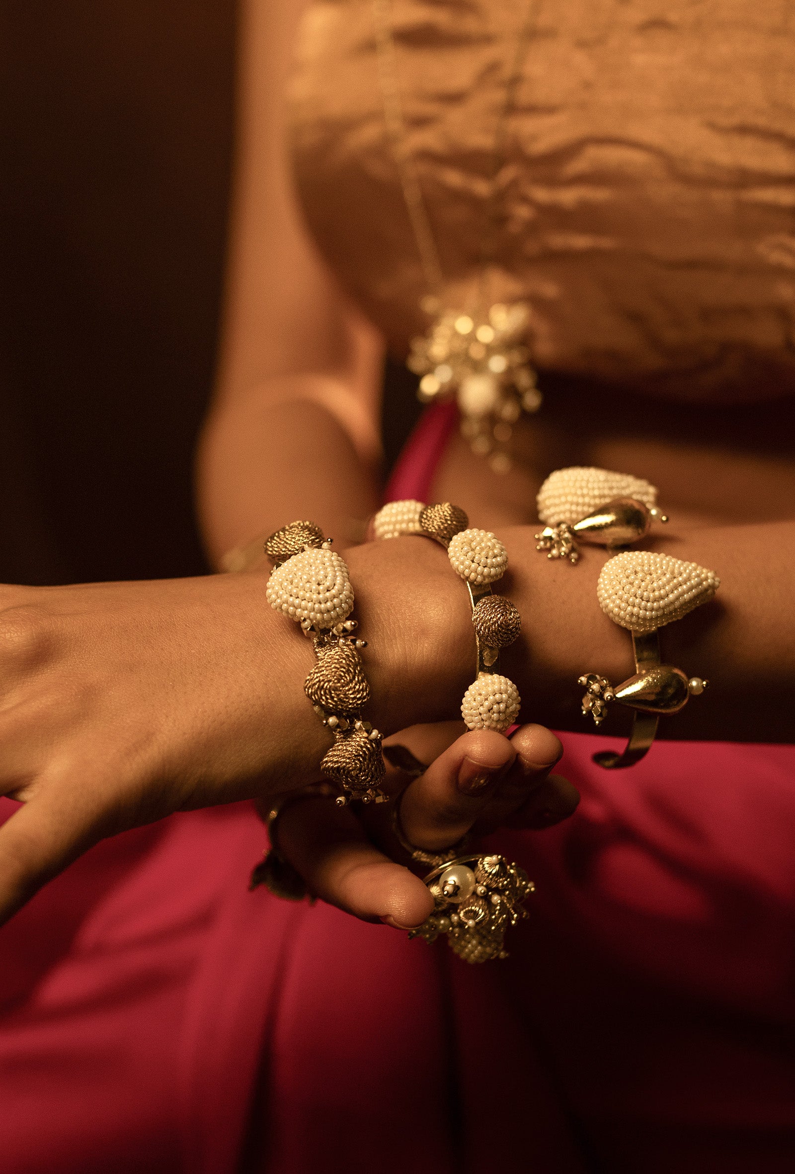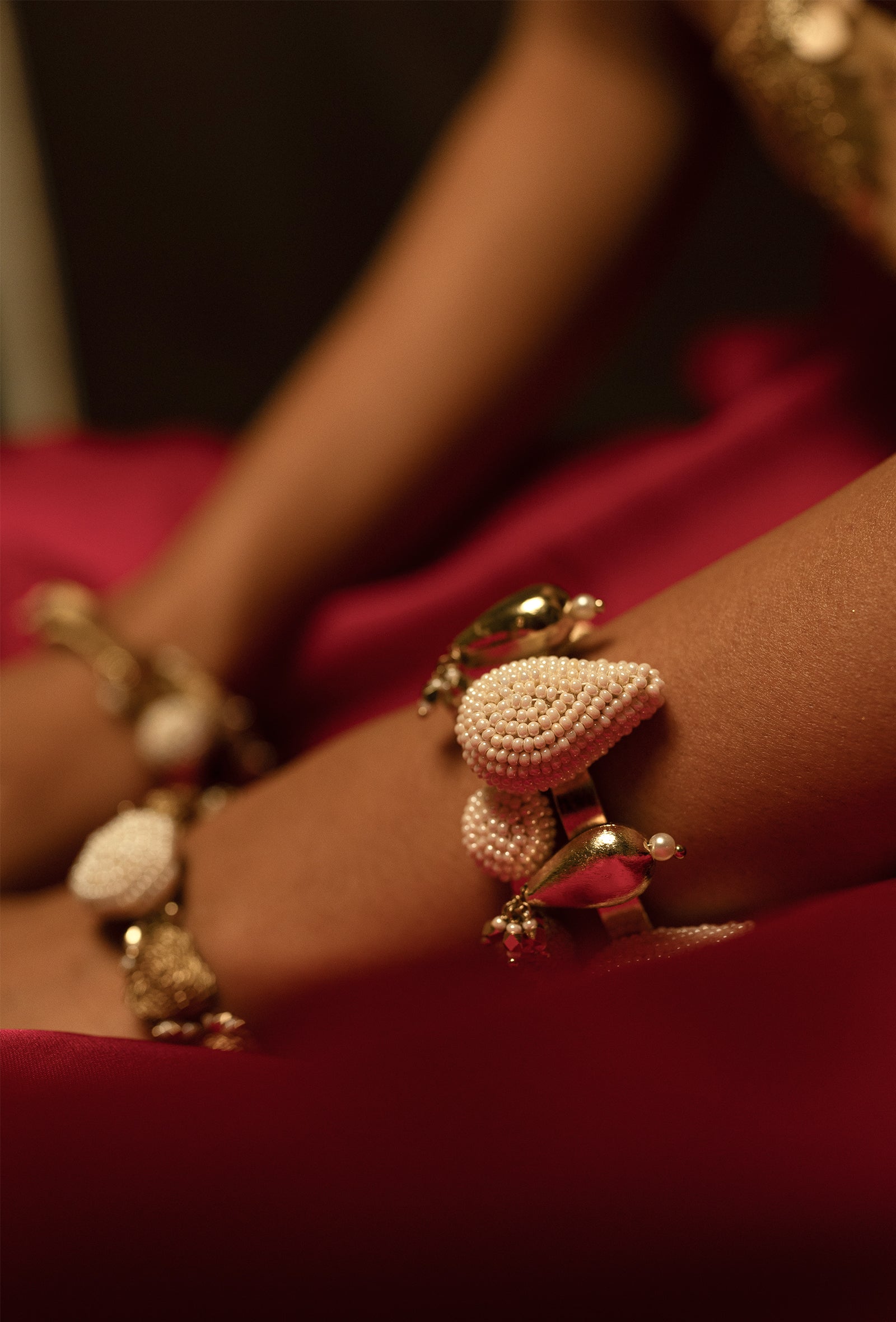 An adjustable bracelet featuring delicate pearl detailing with softly dangling pearls arranged in an elegant conical silhouette. Crafted on a refined base, the design brings gentle movement and understated charm, making it ideal for festive occasions, pre-wedding celebrations, and elegant everyday styling.