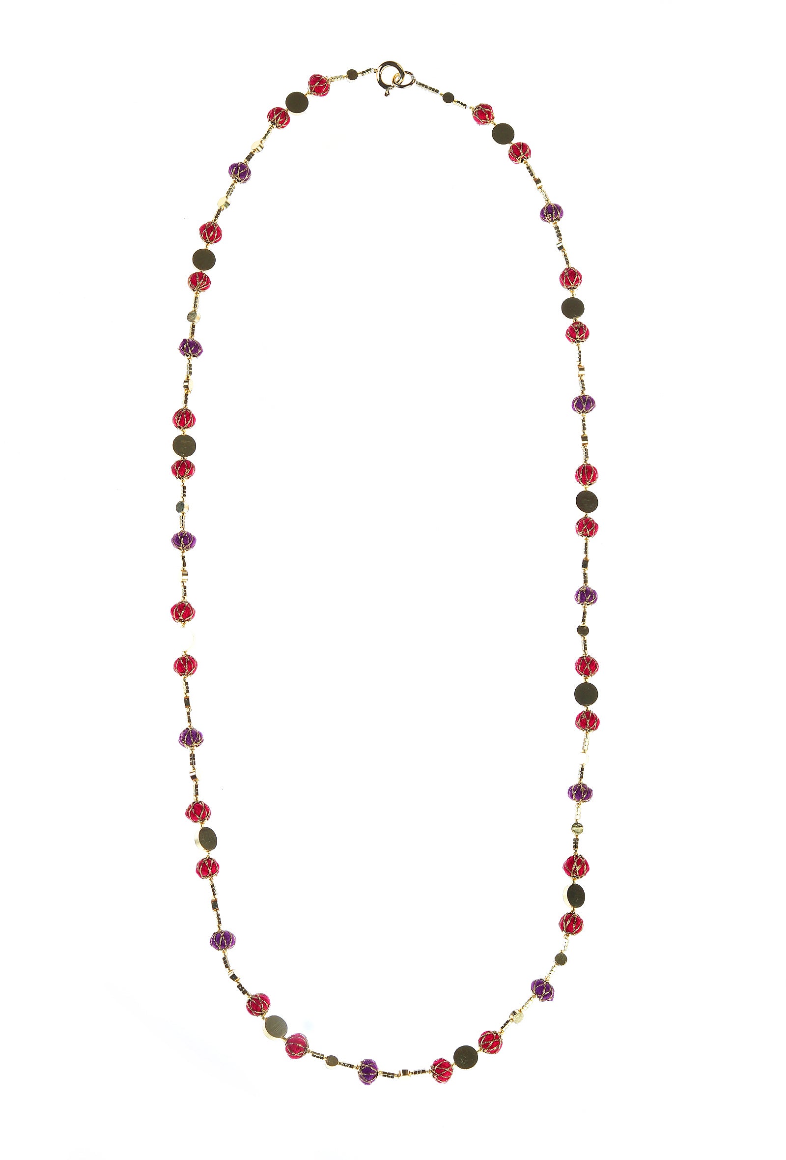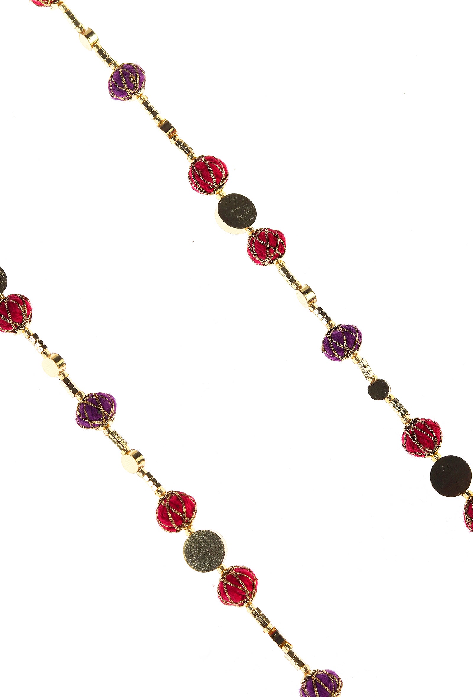 A harmonious blend of pink, purple, and gold, Raas captures the poetry of colour in motion. Handcrafted with gold-toned brass components and delicate glass beads, this long Matar Mala draws from festive traditions while embracing a contemporary softness.