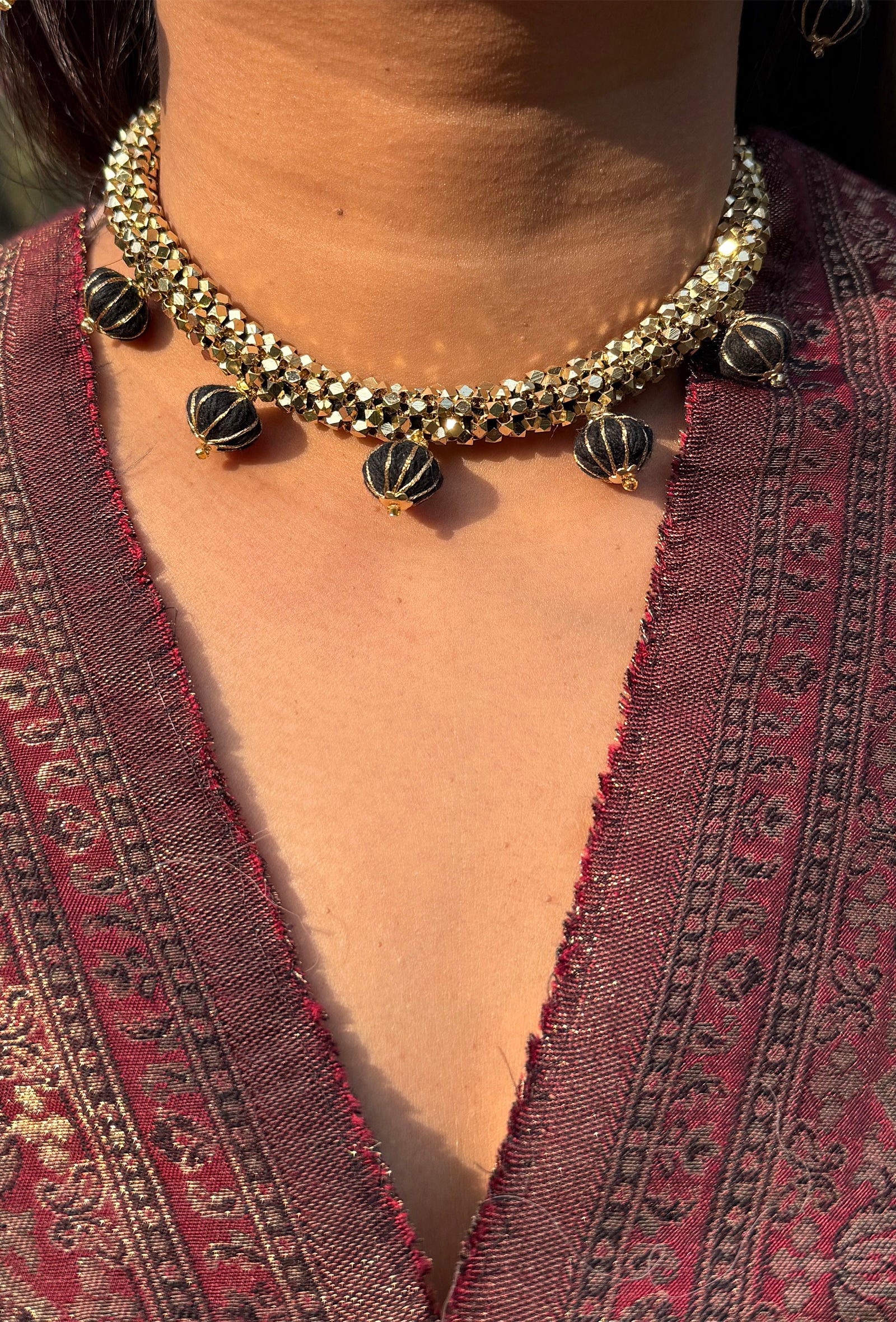 Crafted with gold-toned metallic beads and fine thread work, this necklace is a timeless essential designed for everyday elegance. Minimal in form yet rich in texture, it blends effortlessly with Indian silhouettes and modern Western styles alike. Lightweight and versatile, it is a classic piece meant to be worn on repeat, easy to layer, easy to style, and always understated.