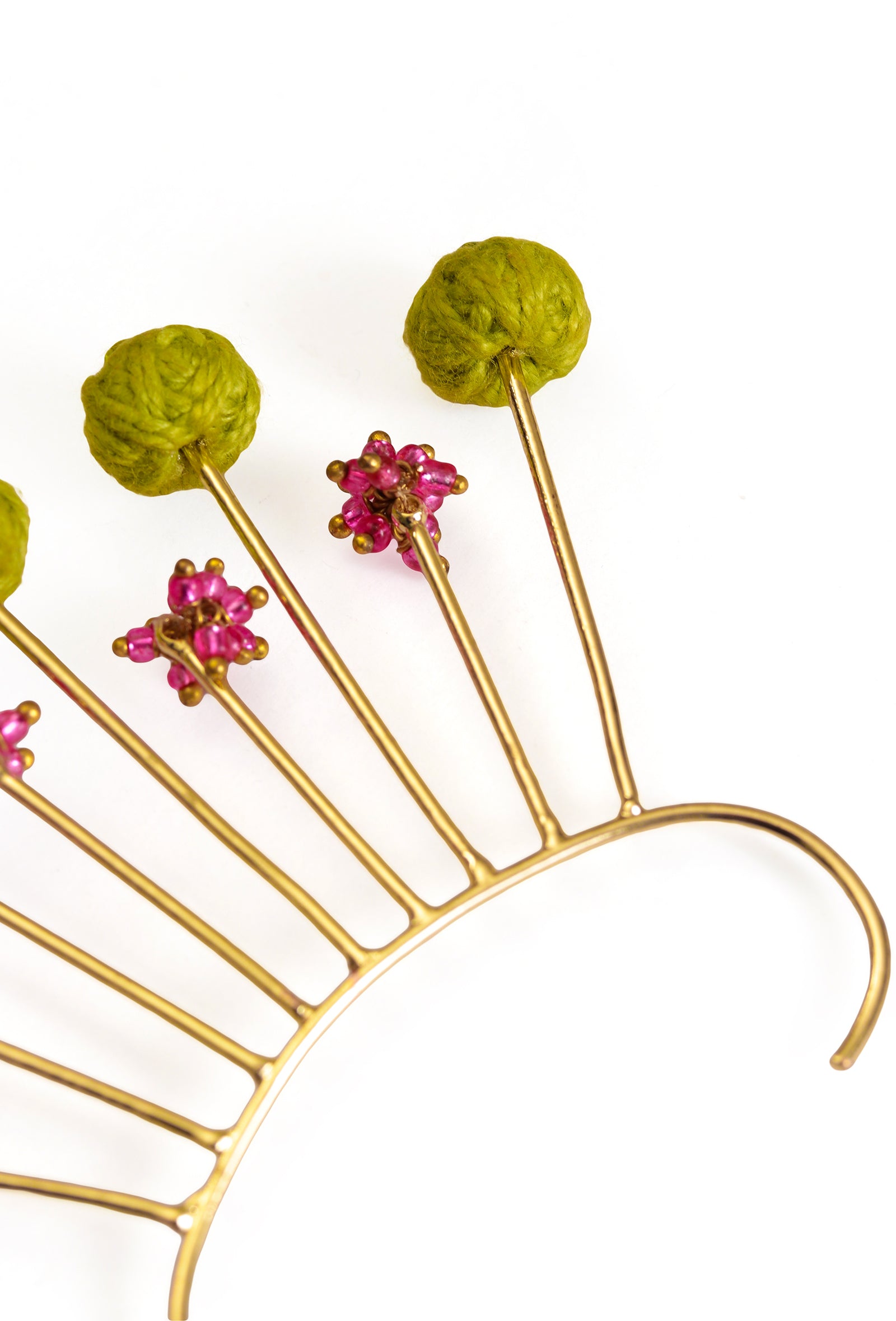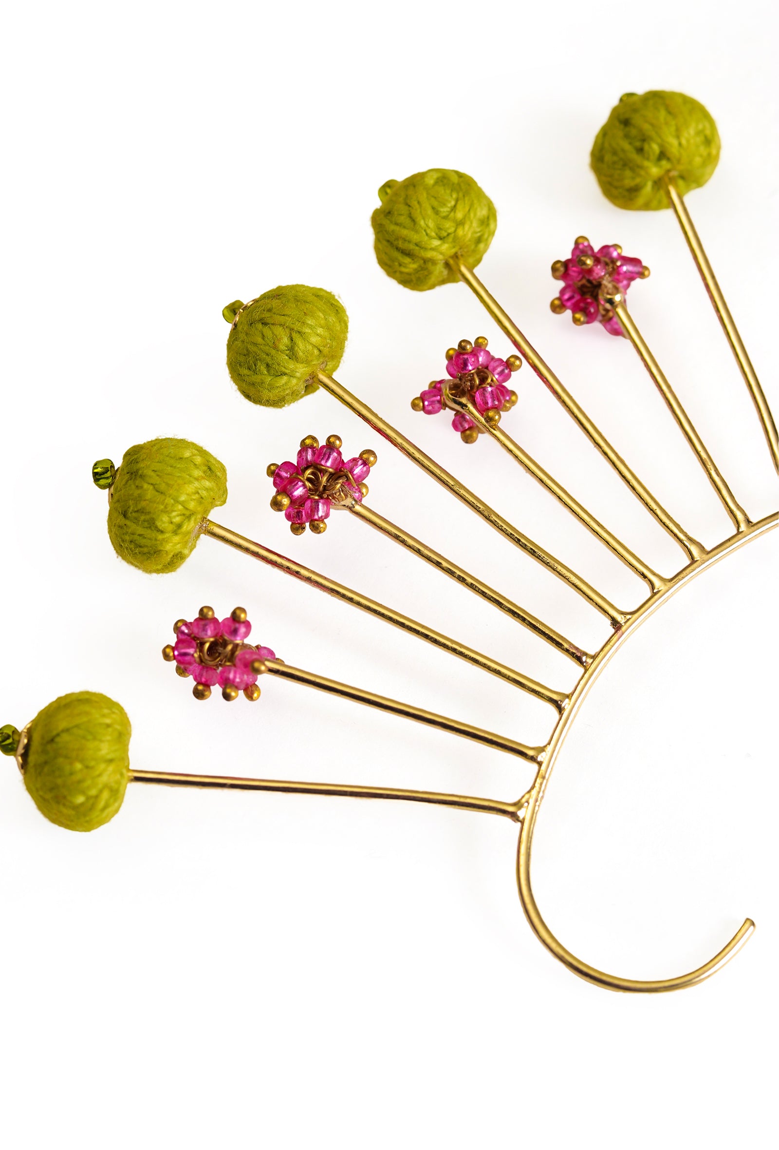 - "Inspired by intricate motifs, the Taraana Earcuff is a testament to heritage craftsmanship. Handcrafted from gold-plated brass, it is adorned with delicate glass beads and meticulously woven zari and cotton threads, capturing the richness of age-old artistry. This exquisite design seamlessly blends tradition with contemporary elegance, draping the ear in celestial charm. Lightweight yet striking, the Taraana Earcuff is a timeless statement piece for those who appreciate fine detailing and refined beauty."