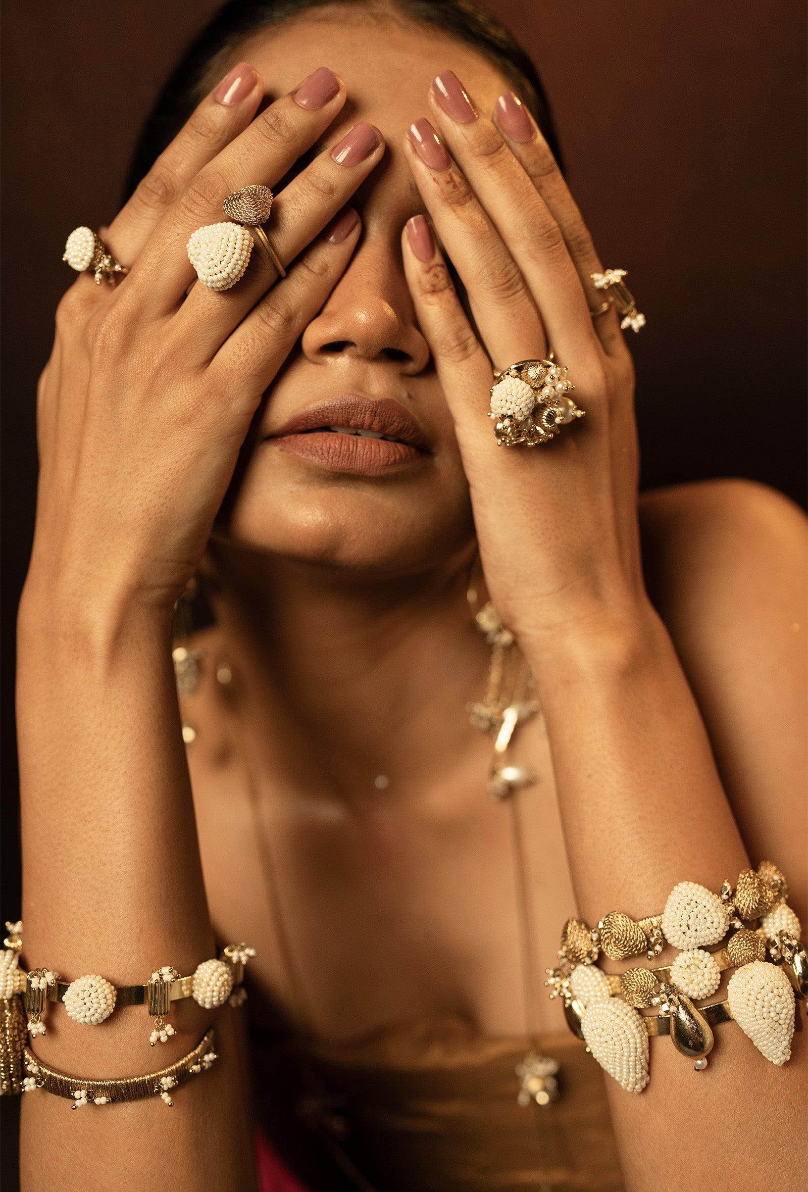A celebration of nature and artistry, this ring is inspired by a forest in bloom and the rhythm of floral dance fields. Crafted with pearls and brass elements, it forms a delicate bouquet pattern, where each tiny flower is shaped and arranged by hand with aman-shilp craftsmanship.