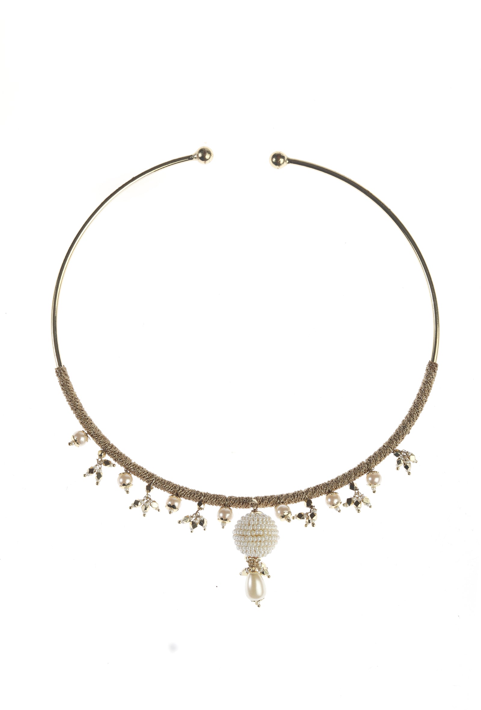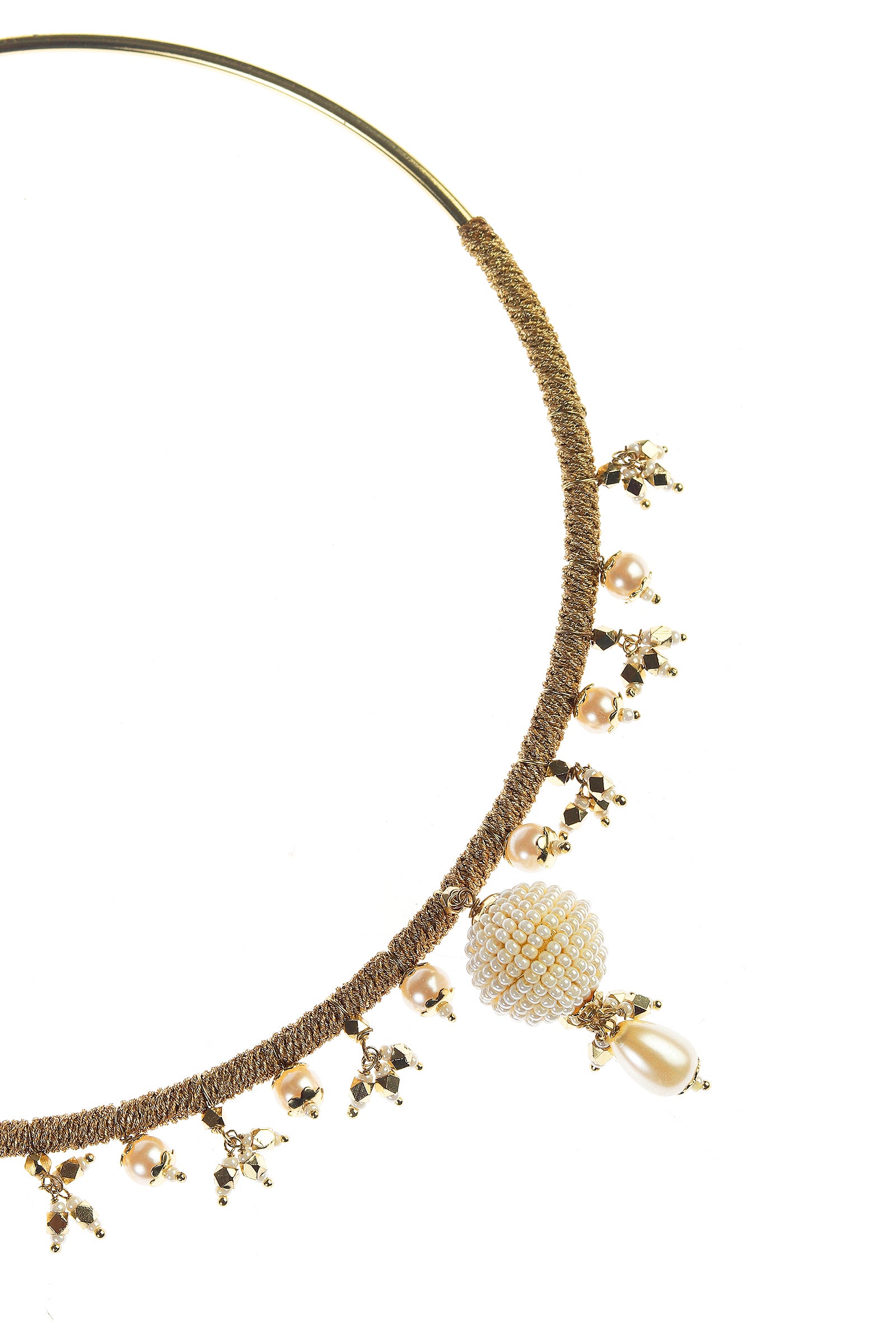 An elegant hasli necklace featuring delicate pearl detailing, crafted with aman-shilp handwork. Its smooth, refined silhouette combined with soft pearl accents creates a timeless and sophisticated look. Perfect for bridal occasions or festive celebrations, this piece adds understated charm while enhancing the grace of any ensemble.
