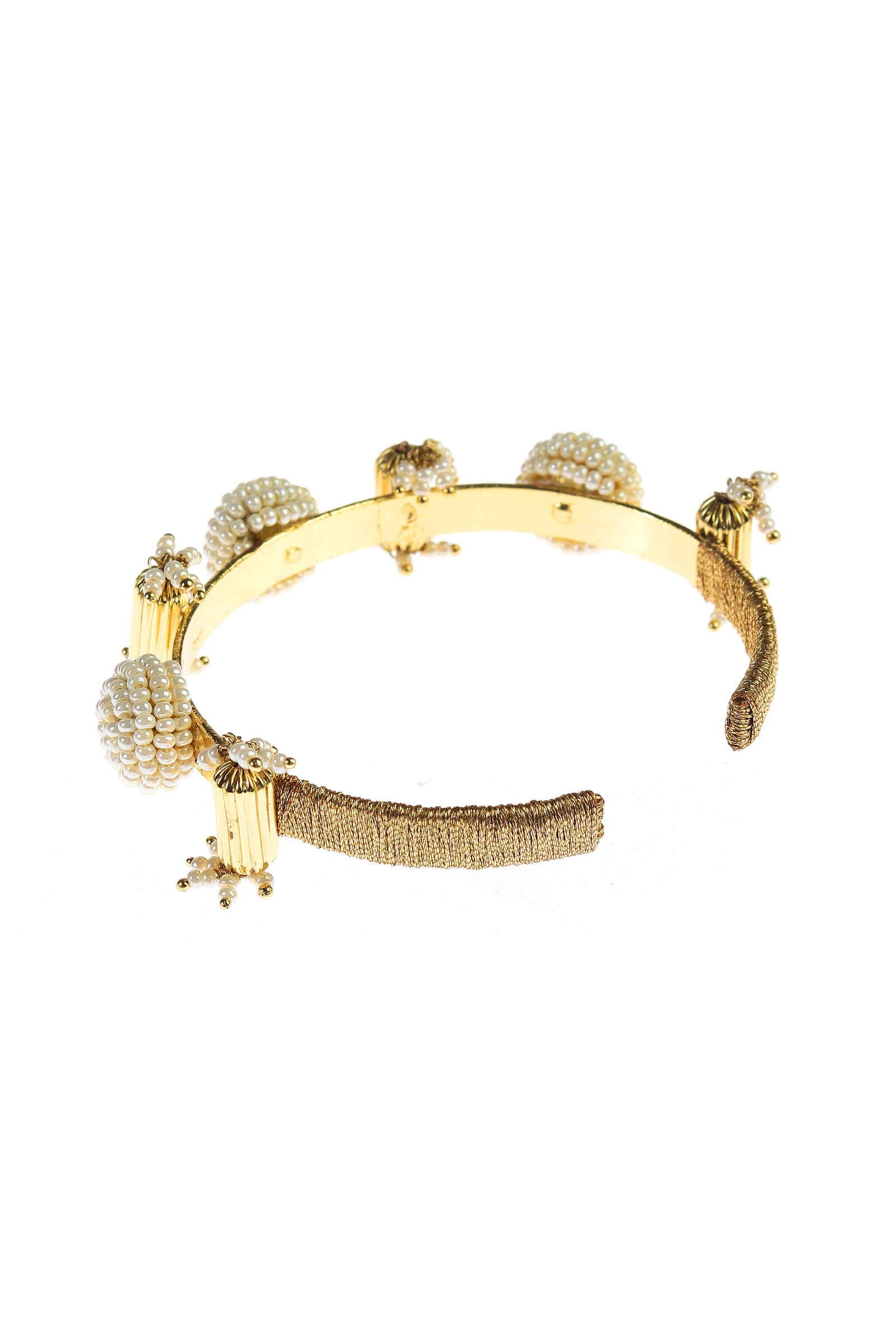 An adjustable bracelet featuring round solid motifs with intricate pearl detailing and delicate danglers. Crafted on a brass base, it offers a perfect balance of structure and softness. Designed for festive and bridal wear, this piece adds subtle movement, elegance, and timeless charm to any look.
